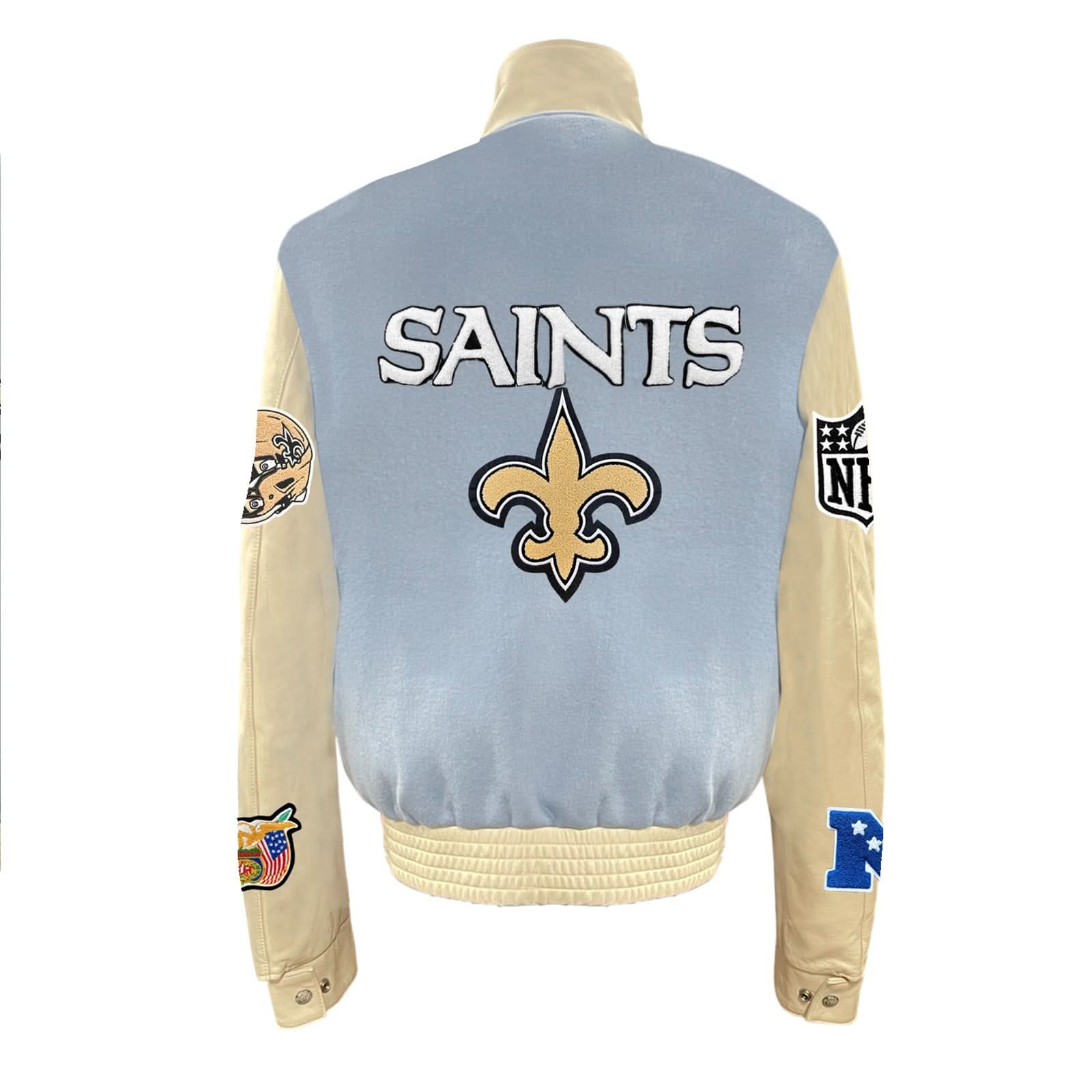 New Orleans Saints Wool & Leather Old English Varsity Jacket Baby Blue