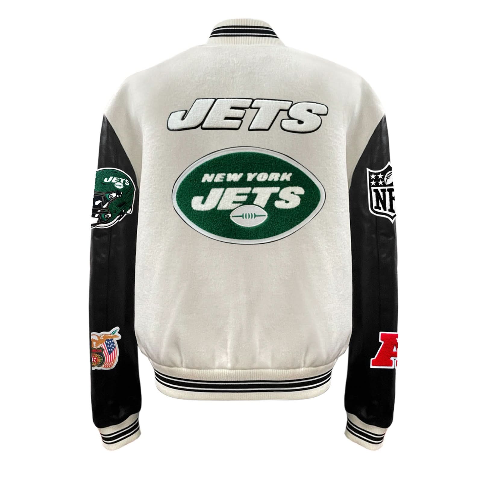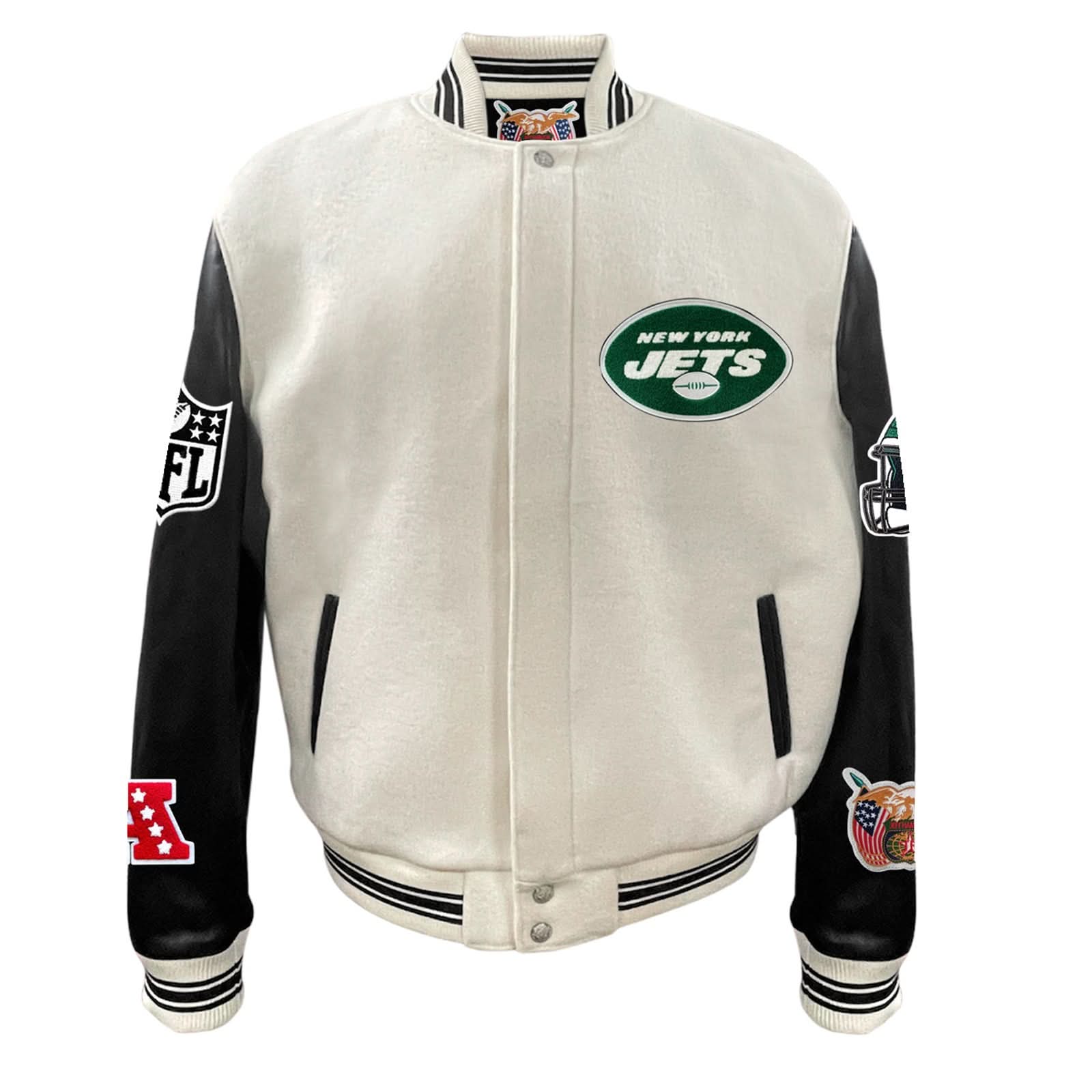 New York Jets Wool & Leather Varsity Jacket Off White/Black