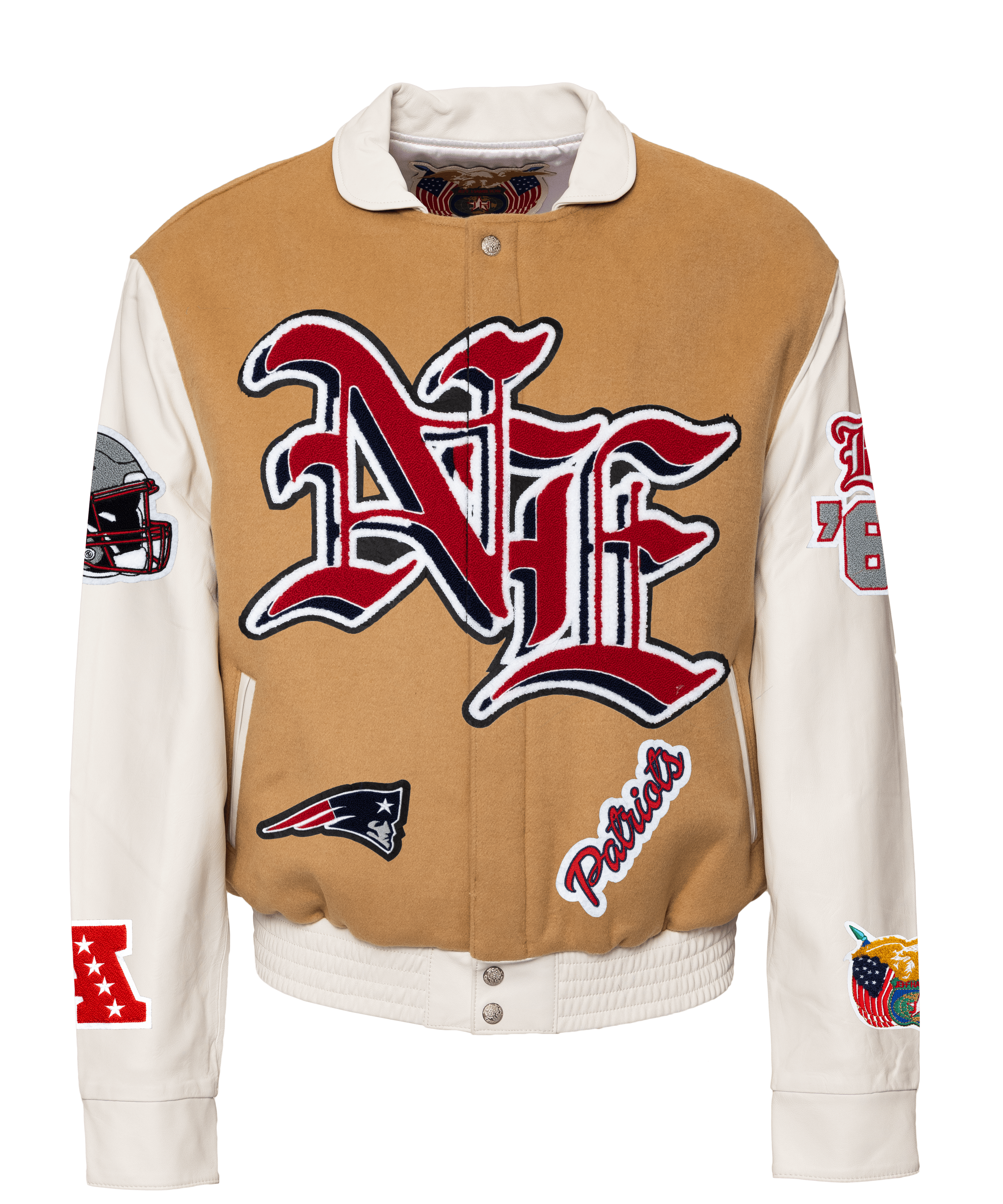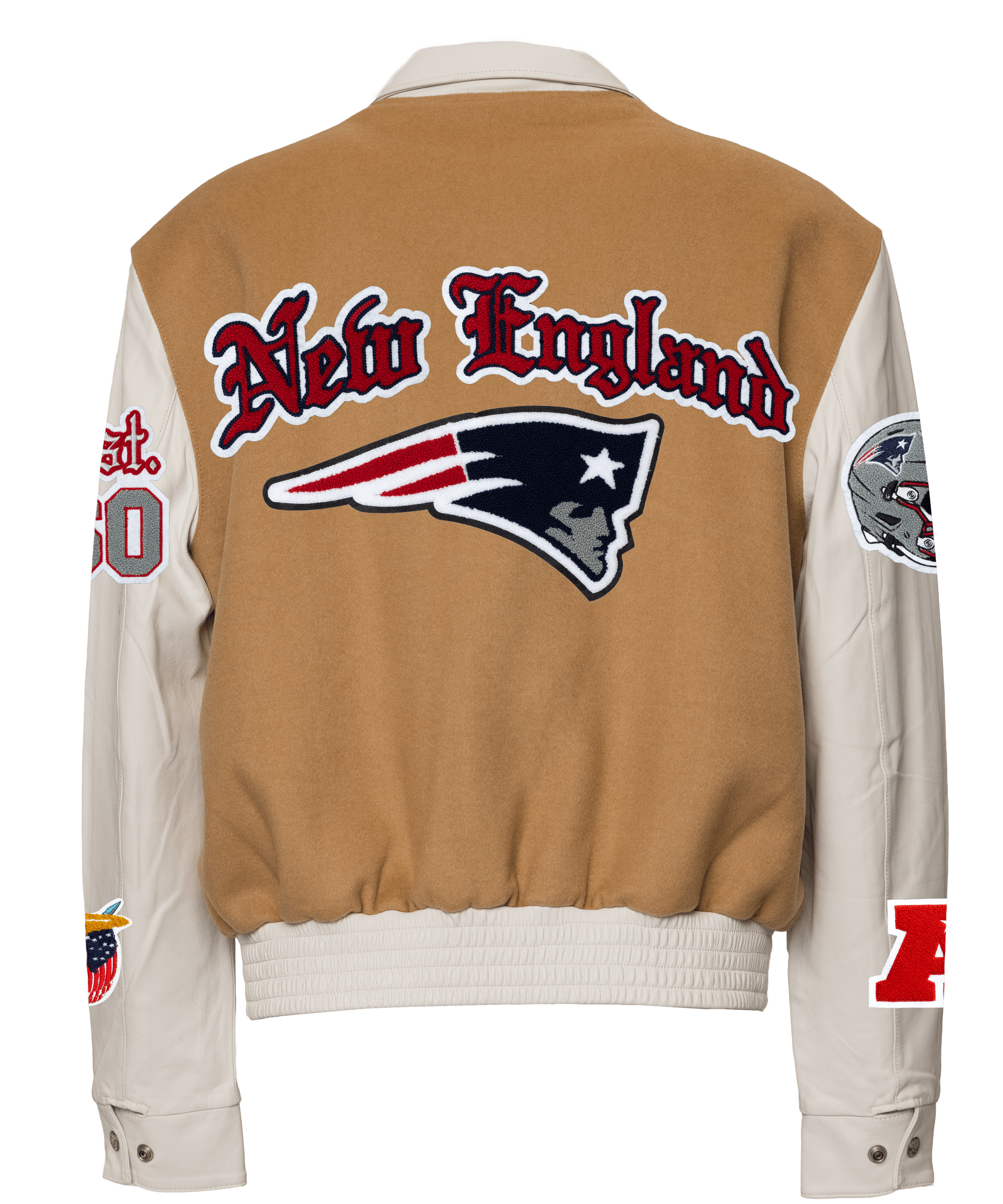 New England Patriots Wool & Leather Old English Varsity Jacket Camel